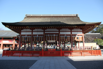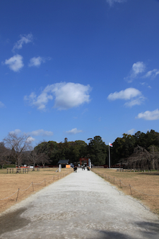 | 二ノ鳥居を潜ると、ようやく神社っぽくなってきた。 白砂利の敷かれた広場に、意味ありげな建物が点在。この無造作感が、お寺とは全然違うところかも。 |