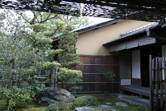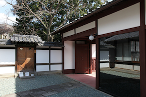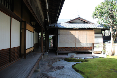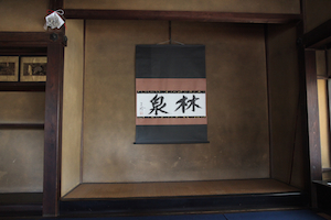 時間になると、邸内から管理者の人が出てきて、中へと案内される。 まず案内されたのは、奥にある茶室である。後に見学する古い書院とは対照的に、三玲が増築した比較的新しい建物である。 |