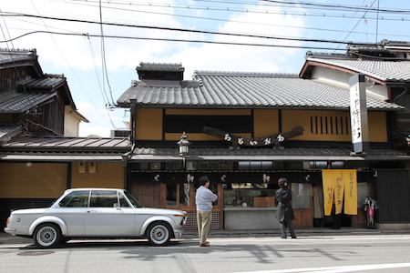 社家の道を戻り、再び上賀茂神社前へ。 最初に訪れた神馬堂には、既にたくさんの来客が。 古都の名店に、古い名車のコラボレーション。 |