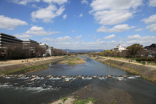 | 目的の場所に行くにはまだ時間が早かったので、コーヒーでも飲みにいくことにした。 鴨川に架かる荒神橋から上流を見る。左岸に見えるのが府立医科大病院。川には飛び石が設けてあって、両岸の散策路を行き来できるようだ。 その飛び石が、よく見ると所々亀の形をしてたりしててカワイイ。 |