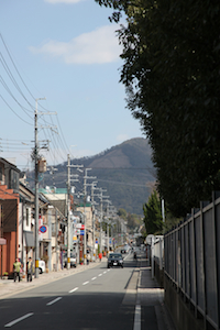 かもがわカフェでは、この日で終わってしまう京都の旅を惜しむかのように長時間まったりとしていた。 カフェを出て、再び荒神橋を渡って近衛通を吉田山に向かって歩いた。 通りの先に見えている山の斜面には「大」の字。そう、五山送り火の大文字山だ。 |