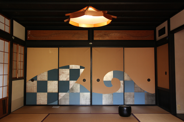 作庭家重森三玲が自ら設計し、空間から装飾類まで全てのデザインを手掛けた茶室「無字庵」。 まず目に飛び込んでくるのが、襖に描かれた意匠だ。 その躍動感溢れる形態は、あまりにも斬新。素朴で質素な美を追求する茶の間に、敢えて躍動感を与えたセンスは凄まじい。 |