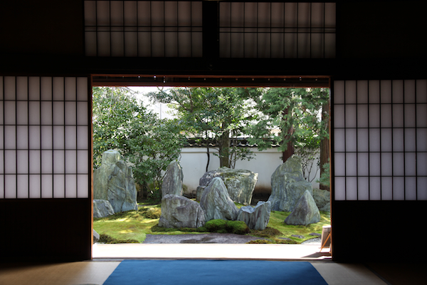 この書院の床の間を背に向けて座した時に眼前に供されるのが、重森三玲自邸の庭園である。 岩と木と苔という要素によって構成されるところは、まさしく枯山水庭園なのだが、通常思い描く禅寺のそれとは明らかに趣が異なっている。 枯山水の精神的世界から更に芸術性が極まり、絵画や彫刻かと見紛うような創造的空間。 |