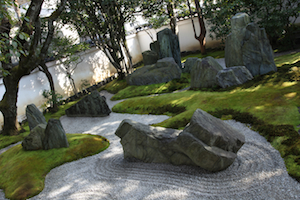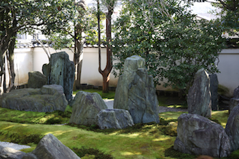 | この庭園を特徴付ける、エメラルドグリーンの岩。 これは徳島産の青石で、重森三玲が作庭時に好んで使った石なのだそうだ。現在は産地から自由に持ち出せなくなっているので、これほどの量を使用している庭園というだけで貴重だ。 |