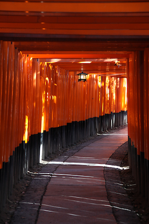 朱塗りのトンネルは、想像してた以上に神聖だ。鳥居そのものが、願いを込められ強い意思を持っているからだろうか。 鳥居と鳥居の隙間から漏れる、傾いた夕陽の光線が、この神聖なる空間をより引き立たせている気がする。 |