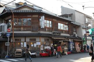 | で、イキナリ上賀茂神社には行かずに、まず腹ごしらえ(笑 上賀茂神社入口近くにある神馬堂で、名物やきもちを買って食べながら神社へ向かう。 人気の店だが、まだ朝早いので待つことなく買うことができた。 |