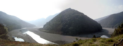 | 311の途中で絶景ポイントを発見! なんと180°ターンする川。こんな珍しい景色に会えてしばし感動。 軽トラで乗り付けてきたおじさんが、脚立と三脚をセットしている。なんでも、この時期川を上るプロペラ船がこの時間に通るとのこと。それを狙いにきたそうだ。しばし眺めて雄大な景色を堪能する。 |