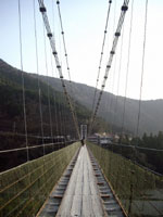 がっしりとしたワイヤーで吊られていて、言うほど怖いとは思わない。なぜか歩行面だけ板張りなんですが。。 ちなみにここ、かずら橋とは違って普通の生活道路(?)で、通学路にもなってたりする。だから通行料はなし(駐車料金はしっかり取られる)。しっかりしたつくりなのも当然と言えば当然か。 |