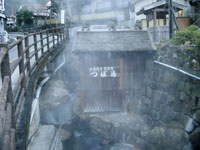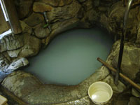 | 小屋の中に入ると、まさにそこには「つぼ湯」。 天然の岩風呂で、奥の方から源泉がふつふつと涌いてきている。 小栗判官の湯治伝説が残る歴史ある温泉で、その泉質も味わい深い。濃厚な硫黄泉は、時々色が変化する神秘の湯だそうだ。 |