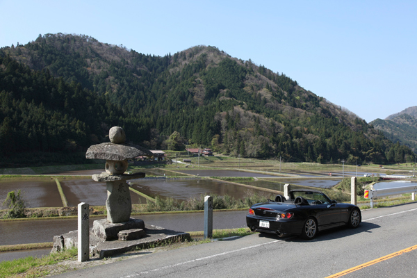 | なだらかな分水嶺の峠を越えたところで、道端に大きな灯籠を見つけてエスを停めた。 | |||||||||||||||||