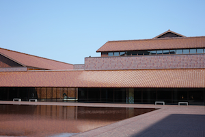 | 広い中庭には、突起物が一切無い。あるのは、床面と同一面に張られた水面だけだ。 象徴的な水面と回廊を覆う大きな勾配屋根が呼応して、静寂な空間が生み出されている。 |