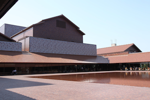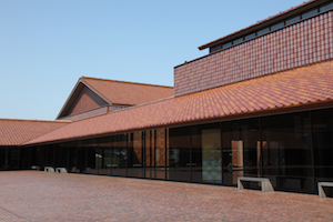 島根県芸術文化センター「グラントワ」 その益田で、立ち寄ってみたかった施設に訪れた。 どの部分を見ても赤、というかオレンジ、てゆーか褐色の色彩で統一された不思議な建物。 褐色の瓦は、山陰地方が山地である石州瓦で、この地方独特の農村風景を形成する伝統的な建材である。 石州瓦の甲冑を身にまとったかのような建築は、一部の大ボリュームを除いて低層で、大きな屋根が空間を覆っているように見える。 |