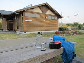 そうやって走っていると、ふと道路端にそこそこ奥行きのありそうな公園のような広場を見つけた。 真ん中にちょっとした東屋がある他には、多少植え込みがしてあるくらい。奥にトイレと水場が見えたので、まるで簡素なキャンプ場そのものという感じ。 |