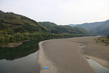緩やかに大きく蛇行しながら流れる四万十川の姿は、下流域に入っても変わらない。 水面見てても、本当に流れているんだろうかと思ってしまうほど水の動きが見て取れない。そんな状況も相まって、非常に静かな風景なのだ。 |