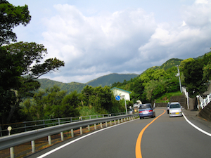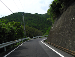 土佐清水市街までは前走車に続いてジリジリ走っていたが、市街地以後は単独走になった。 半島の右側は、集落を繋ぐ素朴で静かな道。時折現れる樹木に挟まれた緑の深い道が南国感を強調している。 |