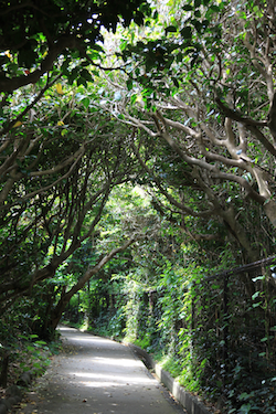 港から離れ、一応漁村の方にも入り込んでみる。 いかにも南国のそれは、神社の入口を覆い被せてしまいそうなほど大きく茂っていた。 |