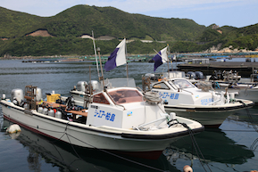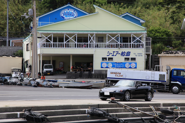 | 眼下に見下ろしていた柏島に到達。早速気になった港の埠頭に来てみた。 停泊している船は、どれも漁船の様相とは明らかに異なった。船に乗せられている大量の酸素ボンベが目に入る。そうか、ダイビングできるんだ。 |