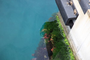 港の景色を眺めている間にも、湾の外からダイビング帰りのボートが戻ったり出て行ったりしていた。 >>> 足元の海の色は透き通ったブルーグリーン。ハリセンボンが泳いでいたが、カメラを向けると急いで隠れてしまった。 |