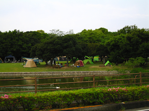 食材を積んで(って言っても肉とビールくらいだが)R56を北上すると、間もなく須ノ川公園という所に着いた。 この芝生の広場がそのままキャンプ場になっている、というのも一目瞭然で、、昨日に続き既におびただしい数のテントが・・・ |